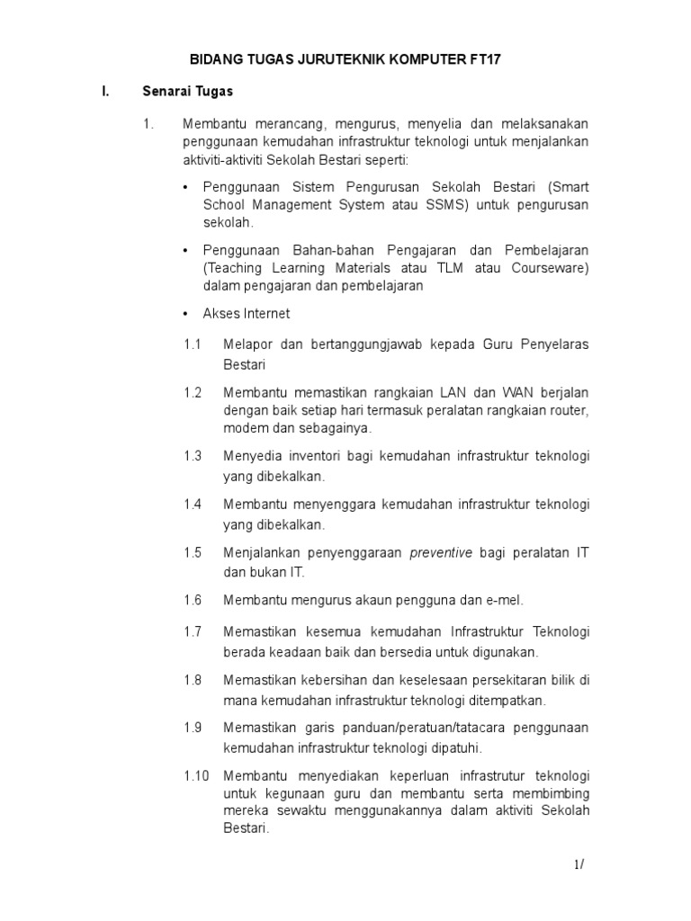 Deskripsi Kerja Jawatan Juruteknik KETERANGAN KERJA Jawatan. Deskripsi Tugas Dan Gaji Juruteknik Komputer Gred FT19Apakah skop kerja seorang Juruteknik komputer di Sektor perkhidmatan awam. Masuk kerja pukul 7 balik pukul 7 12 jam.